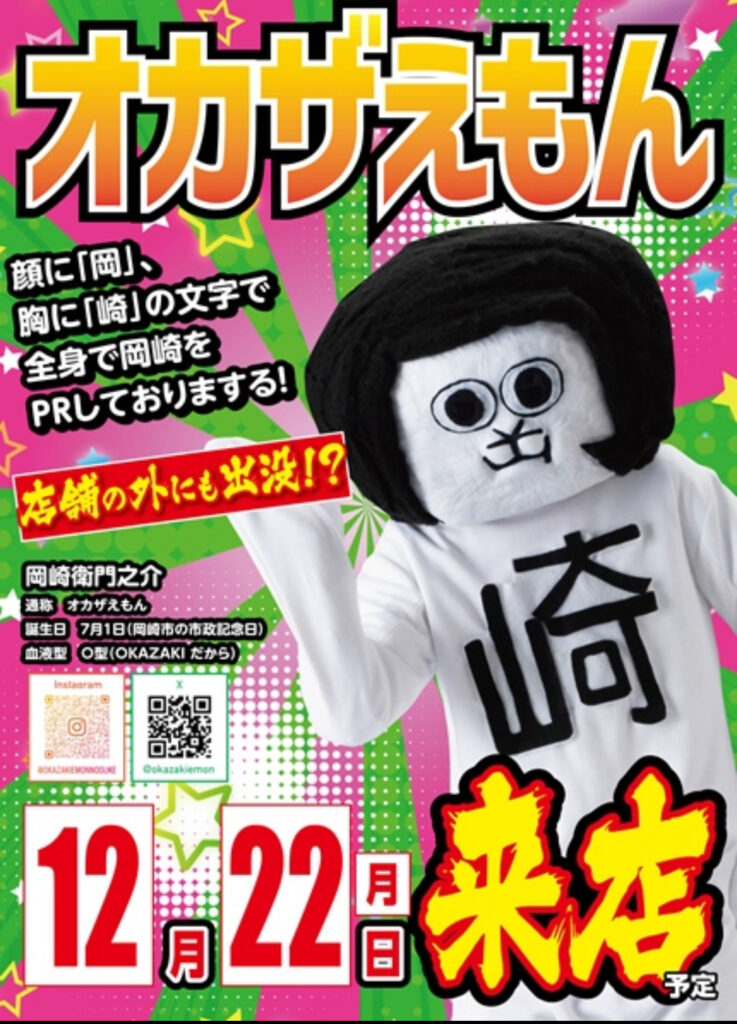 岡崎観光伝道師のオカザえもんが、STINGSのホームゲーム行きますぞ! 始球式や会場内グリーティングで、一緒にSTINGSを応援するぞい! 日時:1月3日(土)14:03~ 場所:1F アリーナコート上(各自のお席でご覧ください)【グリーティング情報】日時:1月3日(土) 12:20〜場所:1F アリーナ・エントランス周辺![]() |