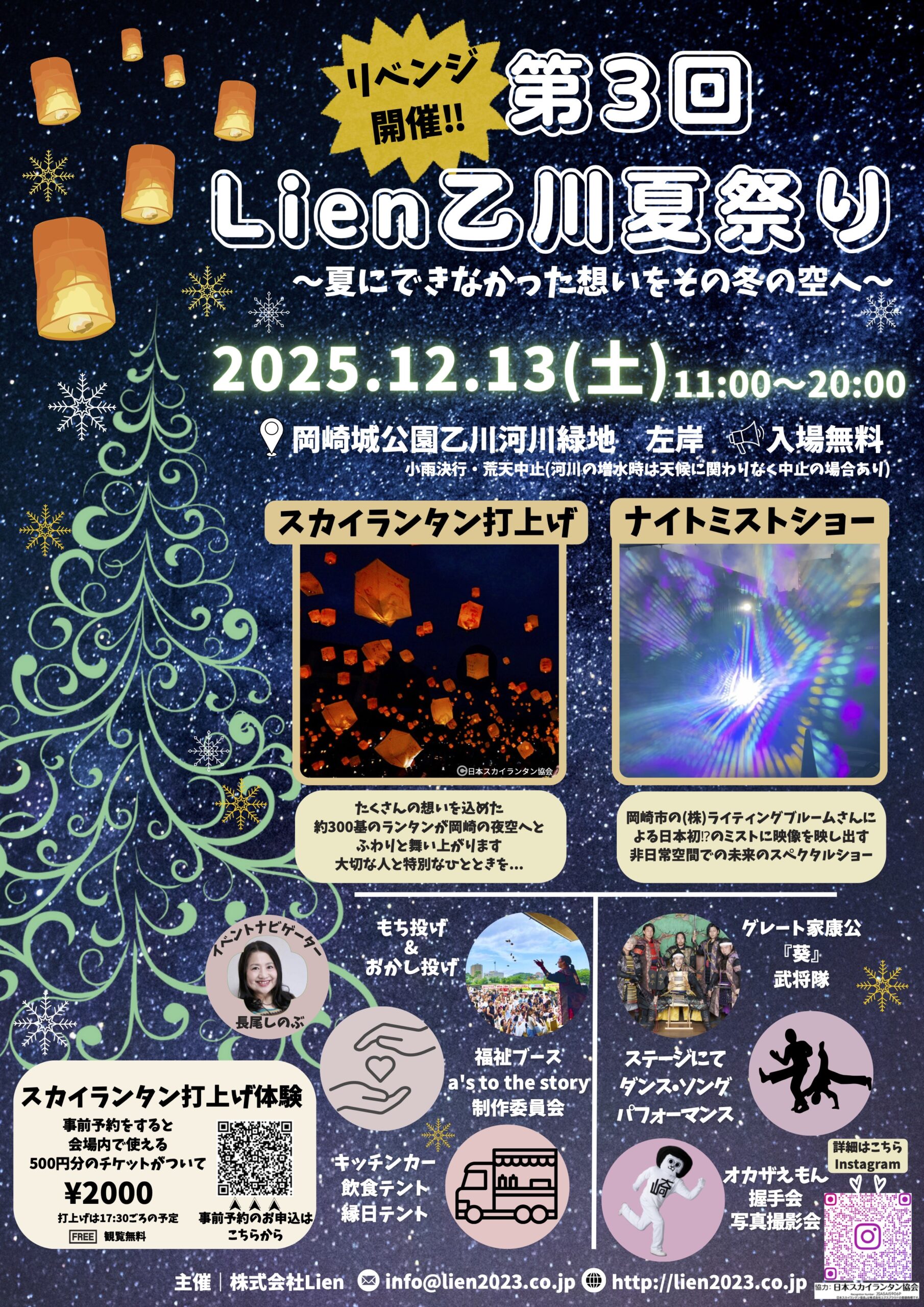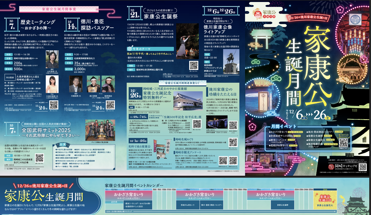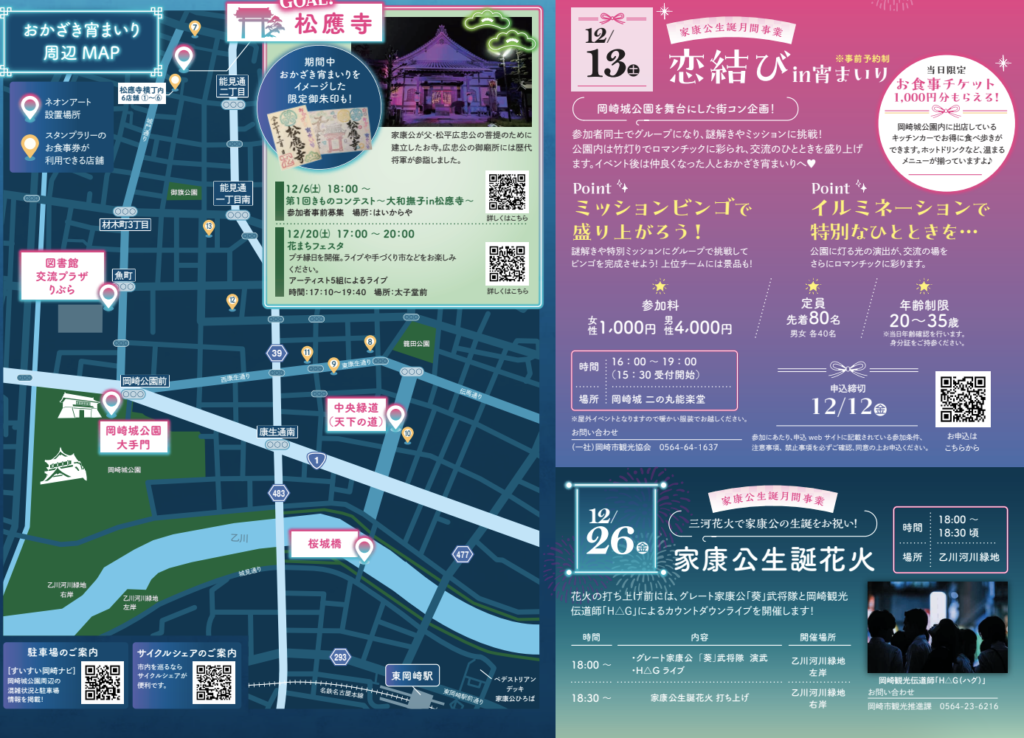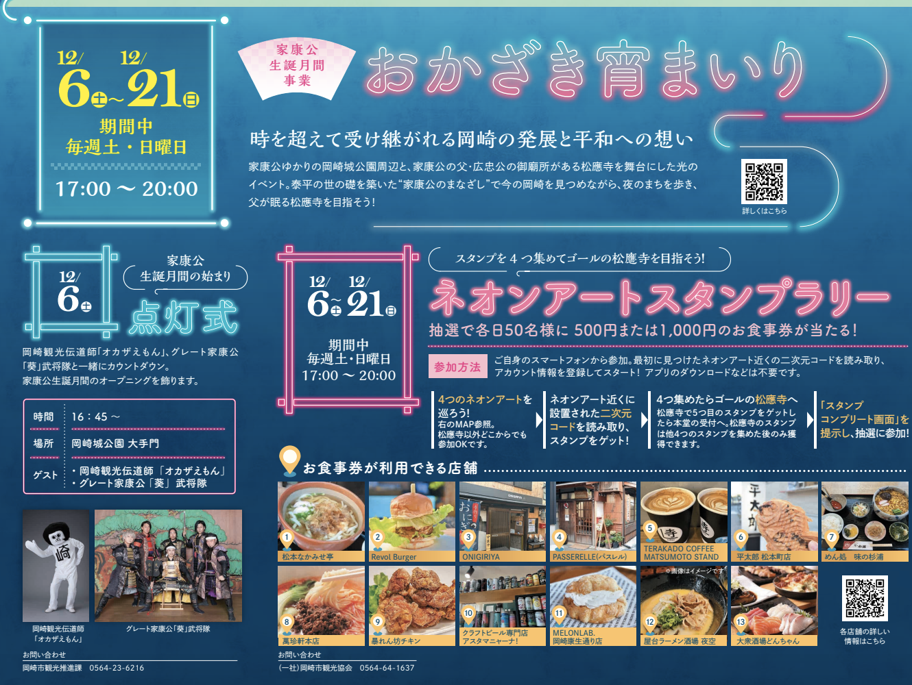 おかざき宵まいり時を超えて受け継がれる岡崎の発展と平和への想い家康公ゆかりの岡崎城公園周辺と、家康公の父・広忠公の御廟所がある松應寺を舞台にした光のイベント。 家康公生誕月間の始まり 岡崎観光伝道師「オカザえもん」、グレート家康公「葵」武将隊と一緒にカウントダウン! ゲスト/岡崎観光伝道師「オカザえもん」、グレート家康公「葵」武将隊 開催日/12月6日(土) 時間/16:45~ 場所/岡崎城公園 大手門 期間中イベント盛りだくさんでござる〜みなさま是非お出かけくだされ〜 ![]() ![]() ![]() |